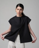 A modern sleeveless top with a sharp, clean silhouette and unexpected front slit detail.