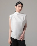 Crinkled texture, a sleeveless top with a high, softly structured neckline.