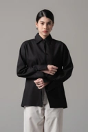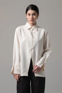 A refined long-sleeve blouse in a soft, fluuid fabric, featuring a classic pointed colar and distinctive knotted button closures along the front.