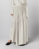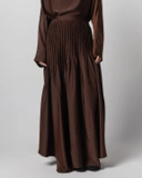The Skirt is designed with delicate micro pleats that fall diagonally toward the right, creating a soft, sculptural flow. The asymmetric diagonal cutting enhances its natural drape, allowing the silhouette to move effortlessly with every step.