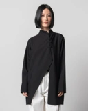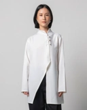 A modern asymmetrical tunic featuring a refined mandarin collar and delicate knot button closures. Designed with a fluid drape and sculpted silhouette, offering effortless elegance for both formal and everyday wear.