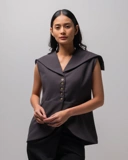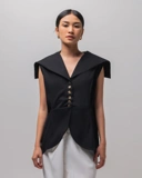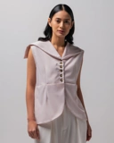 Made from cotton, this vest top has an exaggerated collar with front turquoise button enclosure. the details pinch at the left-right waist. Style the vest with matching trousers.