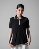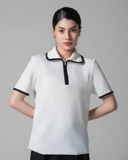 Effortlessly sleek, blouse with features a zip-up front and contrast black piping on the collar. the material hugs the body comfortably, it's perfect for smart-casual occasions or daily wear. Pair with mini skirt or barel pants for casual look.