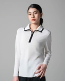 Effortlessly sleek, this long-sleeve top features a zip-up front and contrast black piping on the collar. the material hugs the body comfortably, it's perfect for smart-casual occasions or daily wear. Pair with tailored trousers or skirts for a clean, modern outfit.