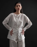 A sleek, long-sleeve blouse, featuring a clean round neckline and an off-center button placket adorned with silver snap buttons for a subtle yet striking contrast