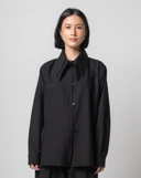 A refined essential defined by its signature double elongated collar and fluid silhouette. Crafted from premium fabric with a soft, graceful drape, this shirt offers a balance of structure and ease. Finished with delicate front button detailing symmetric placement and a relaxed fit, this shirt perfect for both everyday elegance and elevated occasions.